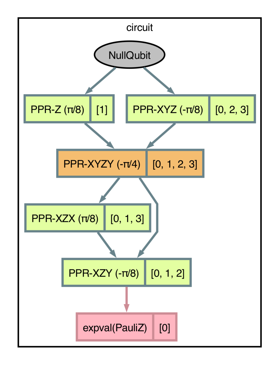 import pennylane as qml import jax.numpy as jnp qml.capture.enable() @qml.qjit(target="mlir") @qml.transforms.reduce_t_depth @qml.transforms.to_ppr @qml.qnode(qml.device("null.qubit", wires=4)) def circuit(): qml.PauliRot(jnp.pi / 4, pauli_word="Z", wires=1) qml.PauliRot(-jnp.pi / 4, pauli_word="XYZ", wires=[0, 2, 3]) qml.PauliRot(-jnp.pi / 2, pauli_word="XYZY", wires=[0, 1, 2, 3]) qml.PauliRot(jnp.pi / 4, pauli_word="XZX", wires=[0, 1, 3]) qml.PauliRot(-jnp.pi / 4, pauli_word="XZY", wires=[0, 1, 2]) return qml.expval(qml.Z(0))